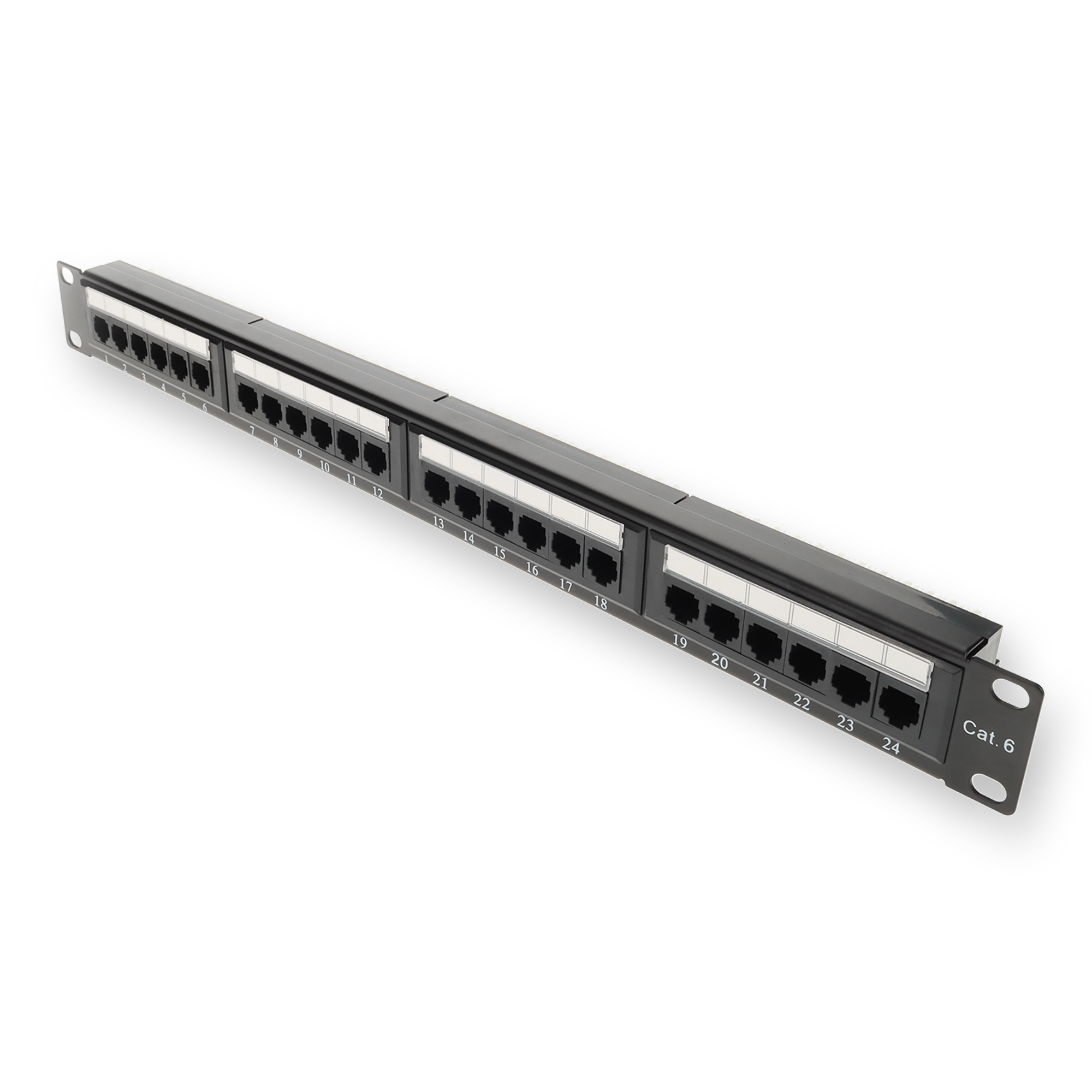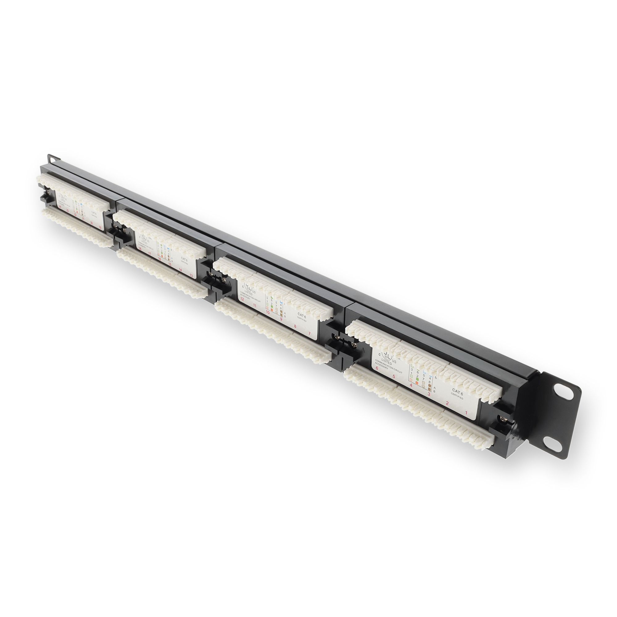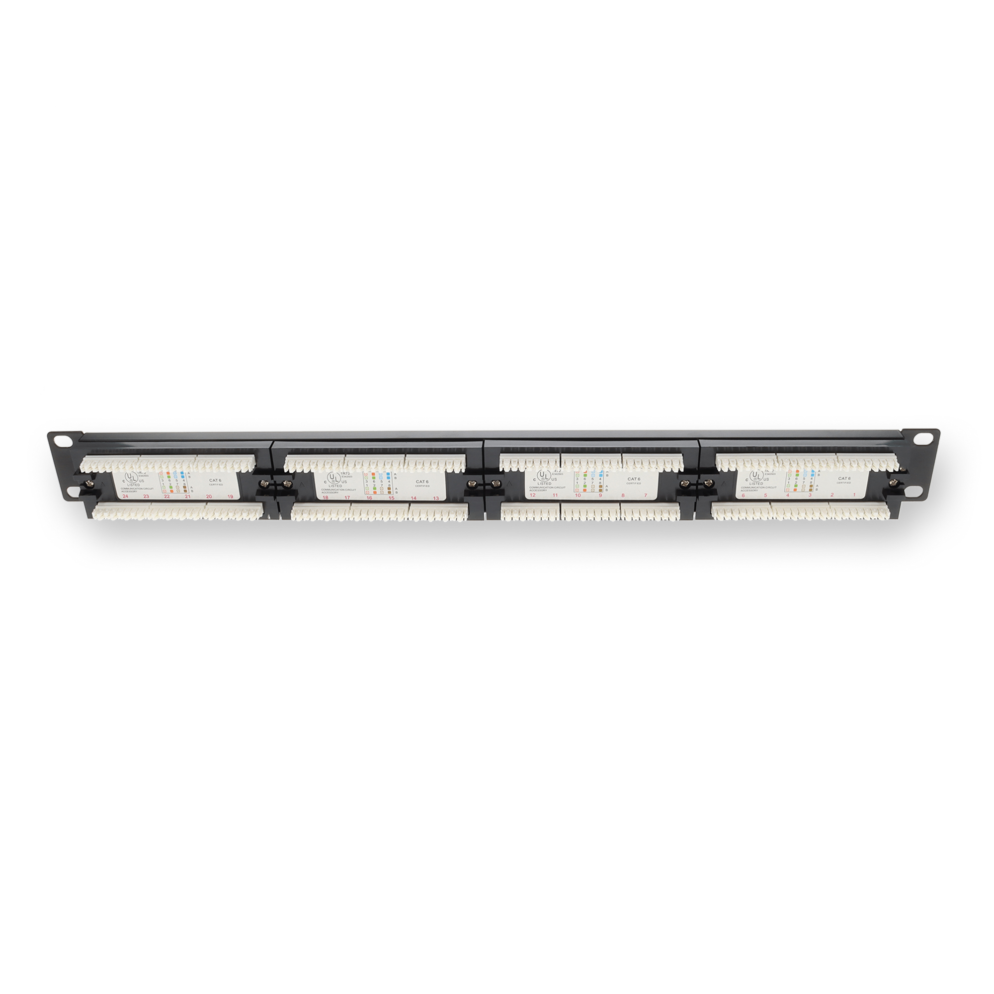 This is a 19-inch 1U CAT6 24-Port Straight Patch Panel with 110-Type. This patch panel provides termination, connection, and management of network cables. It can be mounted to standard 19-inch racks or cabinets and offers flexible cable entry options. Made from durable materials, it offers firm, space-saving protection for your networking cables. Each panel includes removable individual keystones and meets TIA/EIA-568-B industry specifications for connecting hardware. All of our products are guaranteed to work, offering a cost-effective solution for your network upgrade needs.